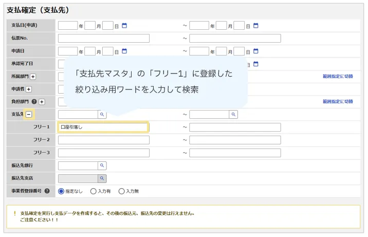 あらかじめ「支払先マスタ」にて「口座引落し」と登録してある支払先だけを絞り込めます。