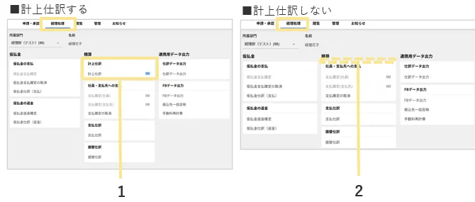 2.「計上仕訳しない」で設定した場合、「経理処理」タブの「計上仕訳」欄が非表示になります。