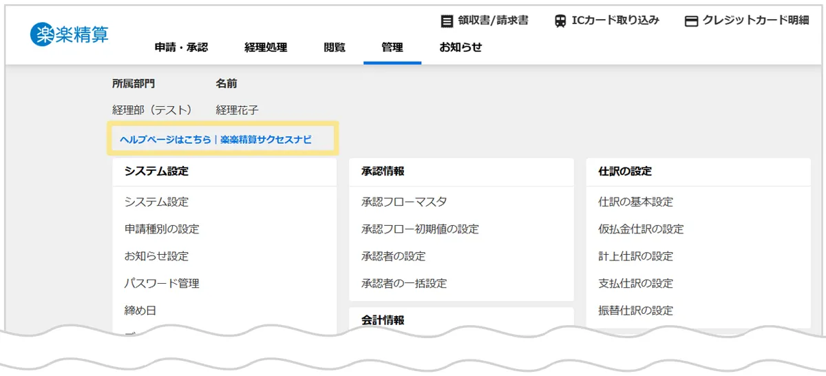「管理」タブ左上の「ヘルプページはこちら|楽楽精算サクセスナビ」から開くことができます。