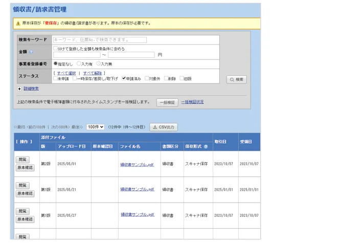- 「管理」タブ > 「領収書/請求書管理」 > 「一括検証状況」 > 「一括検証結果」