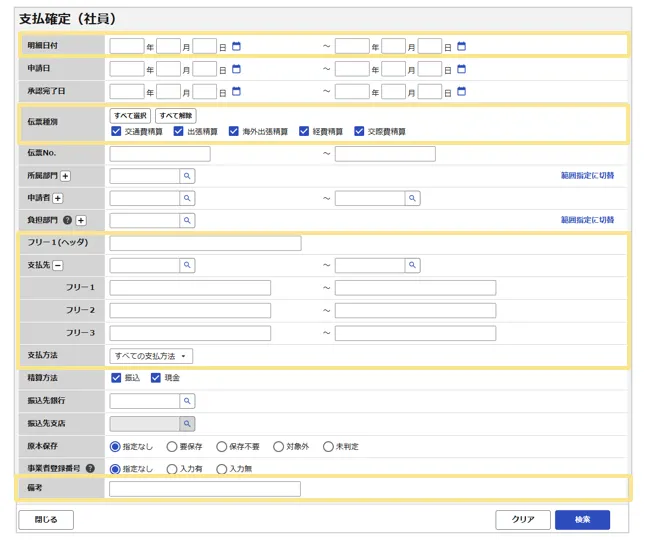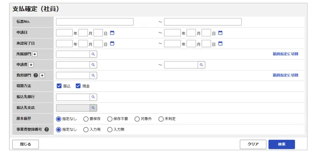 「支払確定」画面での検索条件が追加され、より柔軟な検索ができるようになります。これにより、使用頻度の高い日付関連の検索項目を検索上段に集約し、検索操作の効率が向上します。