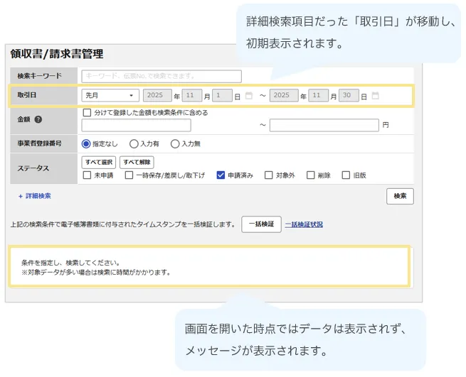 いましたが、検索時の表示速度の改善のため、領収書/請求書データは初期表示されなくなります。