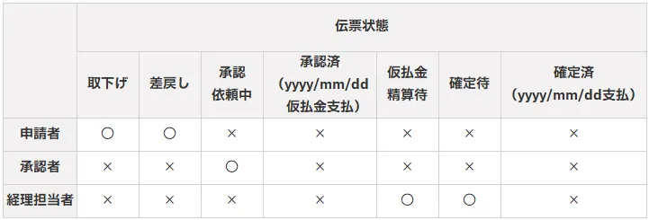 - 伝票を修正するための条件と、ユーザーの役割別(申請者・承認者・経理担当者)の