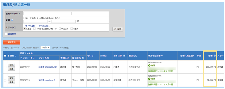 なお、入力した合計金額は「領収書/請求書一覧」画面上でも確認できます。