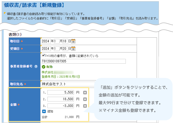 領収書/請求書の登録時、1枚の領収書/請求書の金額を複数明細(最大99行まで)に分けて