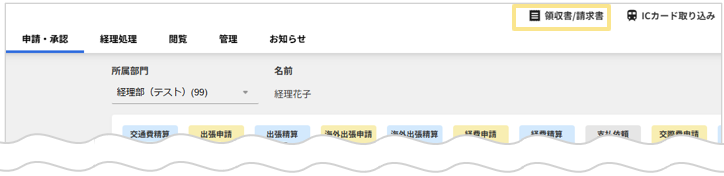 ・申請画面 > 「領収書/請求書」ボタン から開く「領収書/請求書一覧」画面