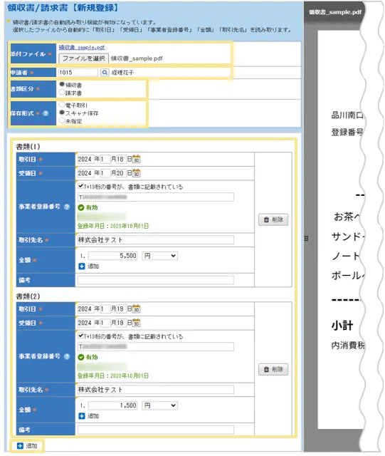 - 複数の領収書を1枚の台紙に貼り付けてスキャンする場合は、「追加」ボタンをクリックし、
