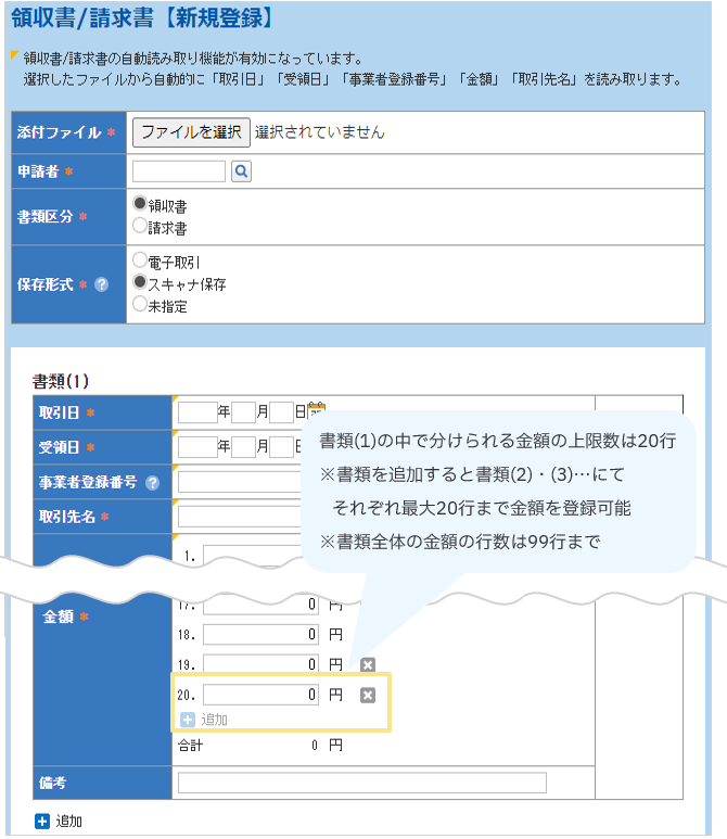 【Before】 1枚の領収書/請求書に対しての上限件数が最大20行