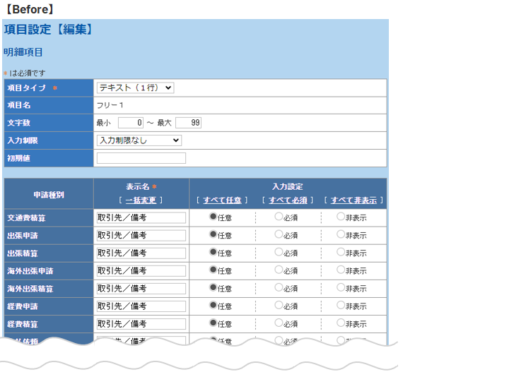 | 【仕様変更前】チェックあり | 【仕様変更後の初期値】 取引先名 備考 |