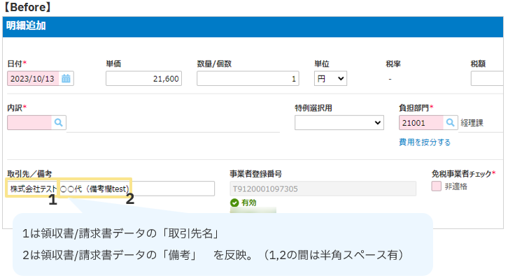 「取引先名」「備考」を会計ソフトに連携されている場合は、