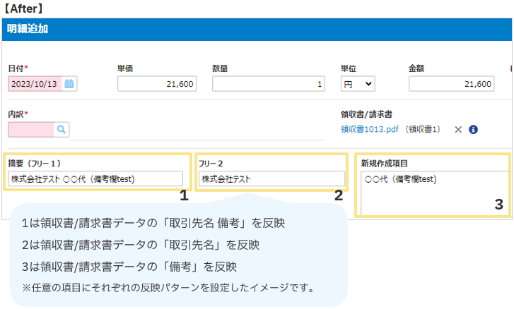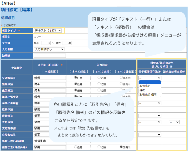 ▶領収書/請求書「取引先名」「備考」をそれぞれ任意の明細項目へ反映可能に