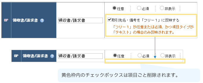 表示されていた 『取引先・備考を「フリー1」に反映する』のチェック項目は削除されます。