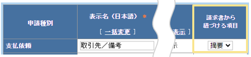 支払依頼の伝票に請求書を添付した際、プルダウンで「摘要」を設定した明細項目には、