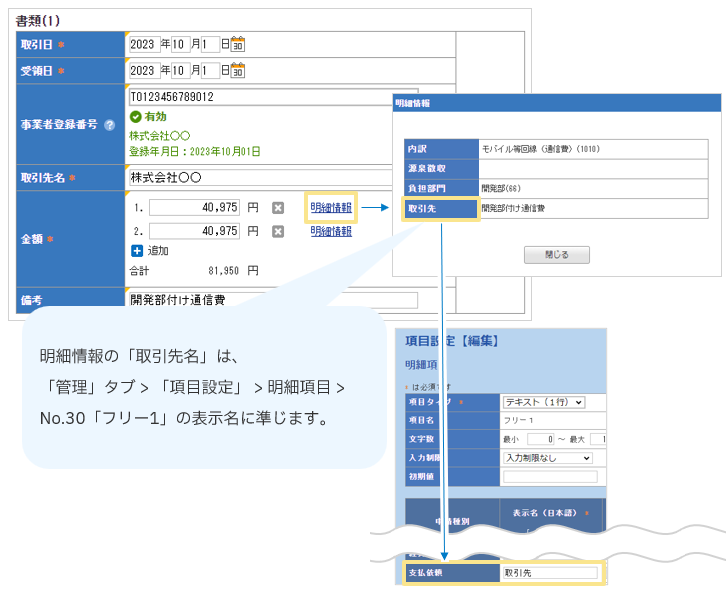 なお「取引先」の名称は、「管理」タブ > 「項目設定」 > 明細項目 > No.30「フリー1」の
