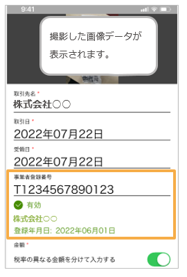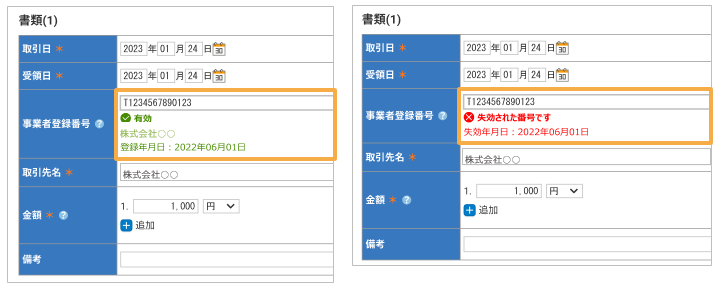 領収書/請求書の登録時、または編集時にも「事業者登録番号」と国税庁のデータベースを照合し、