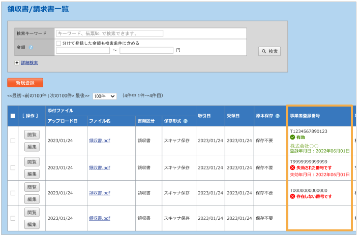 領収書/請求書に登録された「事業者登録番号」の判定結果は、一覧画面や管理画面上にも
