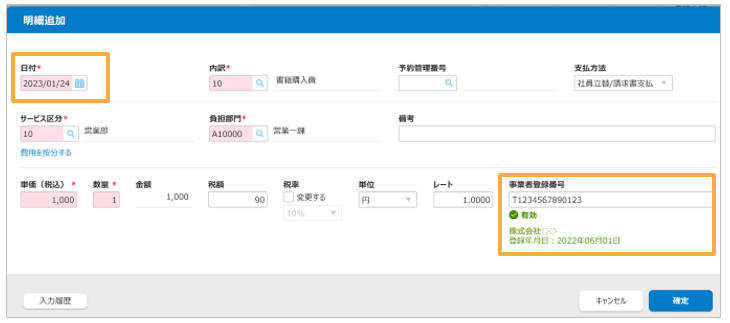 入力された「事業者登録番号」は、伝票明細の「日付」を基準日として自動で有効性を判定します。