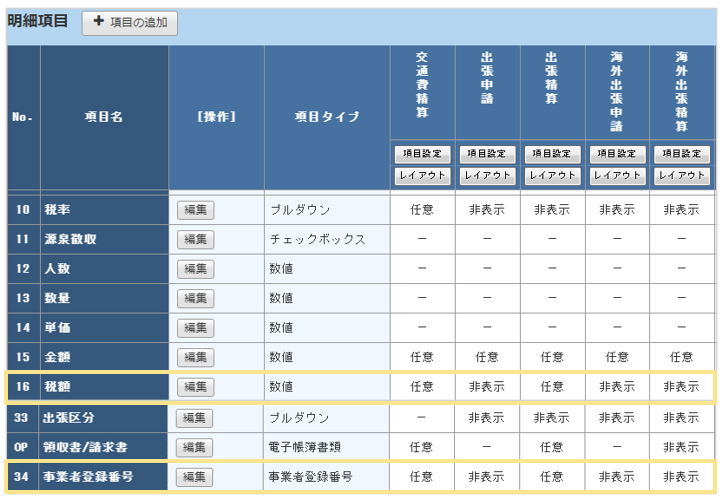 「管理」タブ > 「項目設定」の明細項目「事業者番号」を「任意」にする。