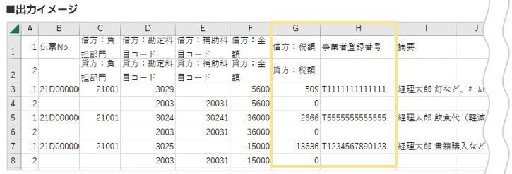 ここでは「適格請求書発行事業者」や「税額」を出力するケースを想定しています。