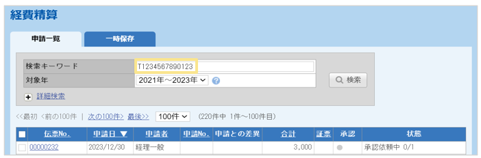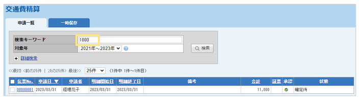 - 各申請種別の「申請一覧」のキーワード検索にて、税額による検索が可能です。