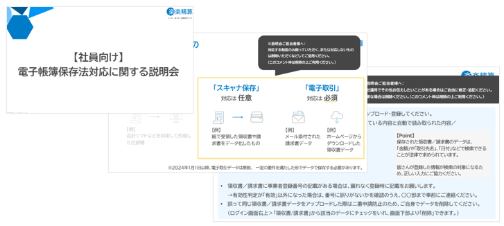 電子帳簿保存法対応をはじめるにあたって、社内向けに説明会を行う際に活用いただける