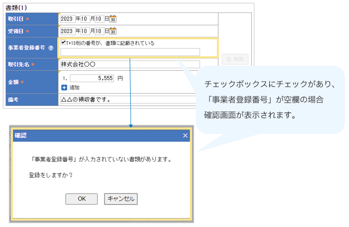 これにより、「事業者登録番号」の入力忘れによる、伝票の差戻しや取下げの負担を軽減できます。