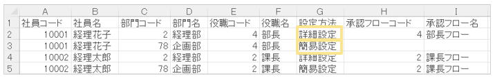 承認フローの設定・修正漏れがないか、CSVの一覧で確認することができます。