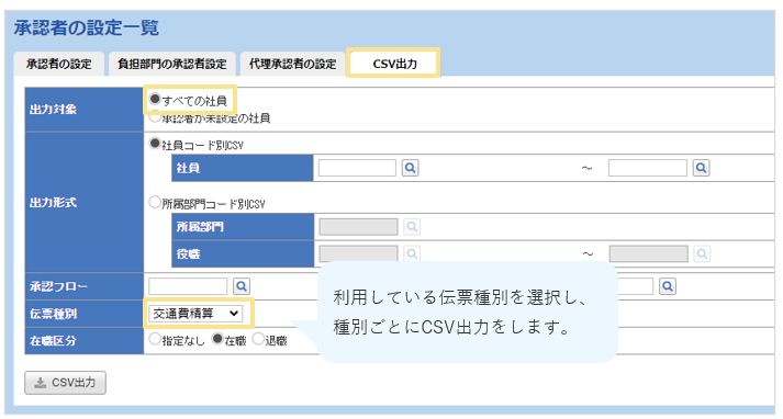 「管理」タブ >「承認者の設定」>「CSV出力」タブより、