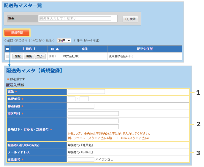 - このページでは「管理」タブ >「配送先マスタ」メニューの画面と機能を説明します。