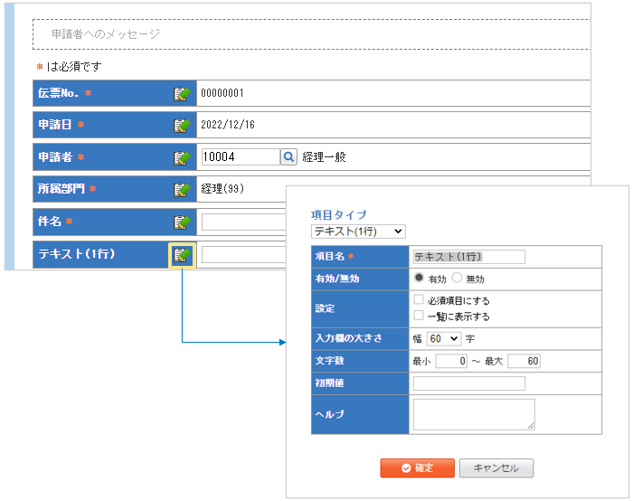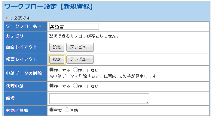 有効/無効:申請画面上に表示するか否かを設定できます。