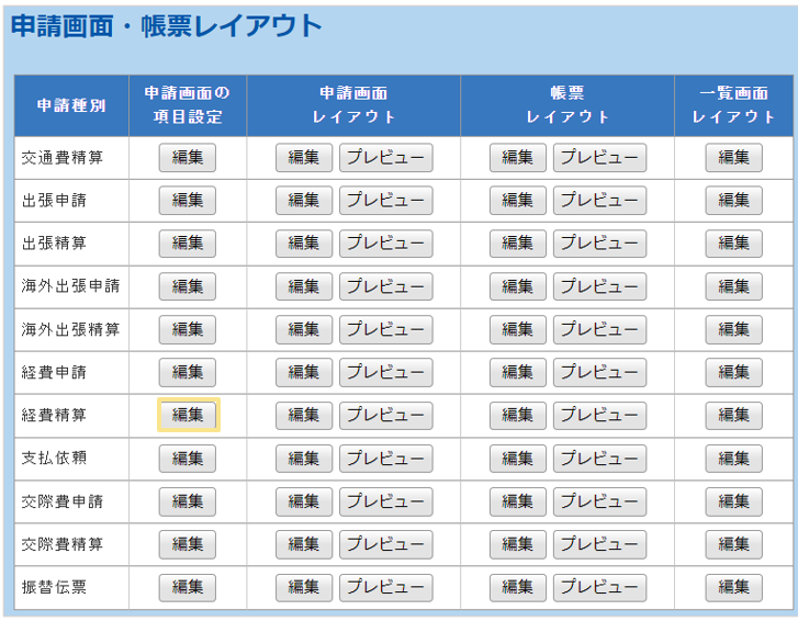 - 「管理」タブ >「申請画面・帳票レイアウト」をクリック