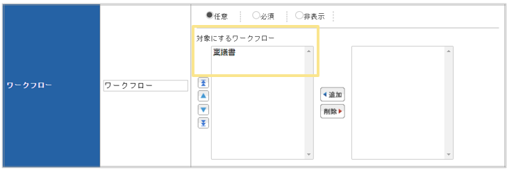 「ワークフロー」項目の「入力設定」を「必須」で設定した場合