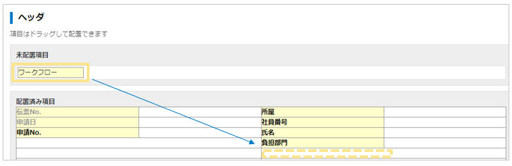 - 「ワークフロー」は申請画面のヘッダ項目としてのみ配置が可能です。