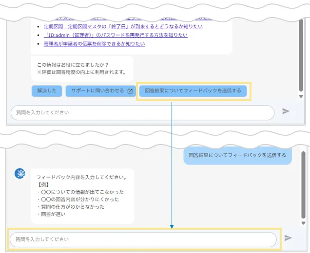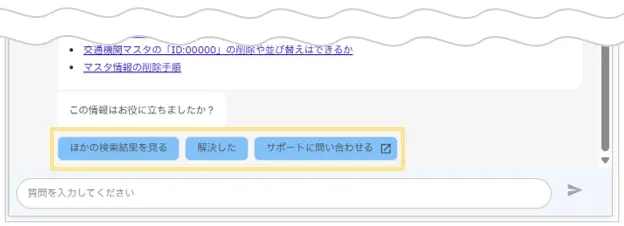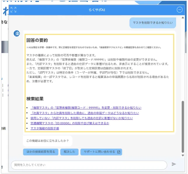 さらに「楽楽精算サクセスナビ」内の関連記事を一覧で表示する検索チャットボットです。