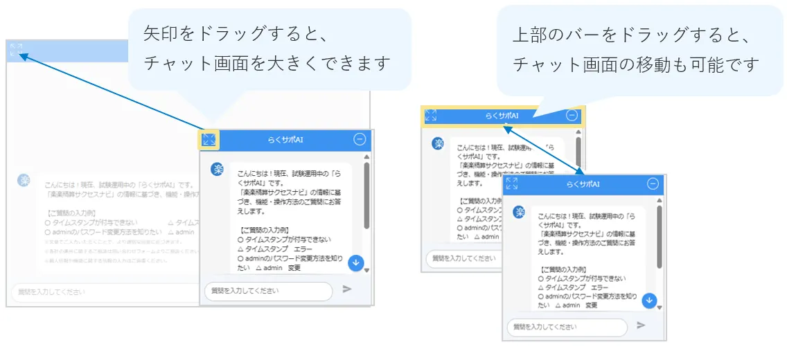 →左上の矢印マークをドラッグすることで、チャット画面を拡大することが可能です。