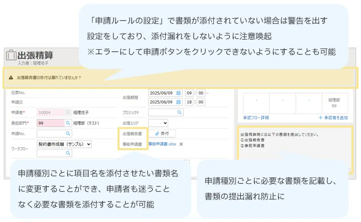 必要な書類が添付されていない精算伝票は申請ルールの設定で注意喚起&差戻しができるように