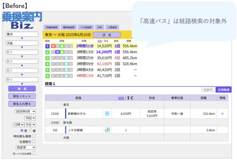 お客様より「高速バスも検索対象にしてほしい」とのご要望を多数いただいており、