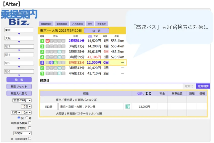 本仕様改善により、「高速バス」も「乗換案内」の検索結果に表示されるようになります。