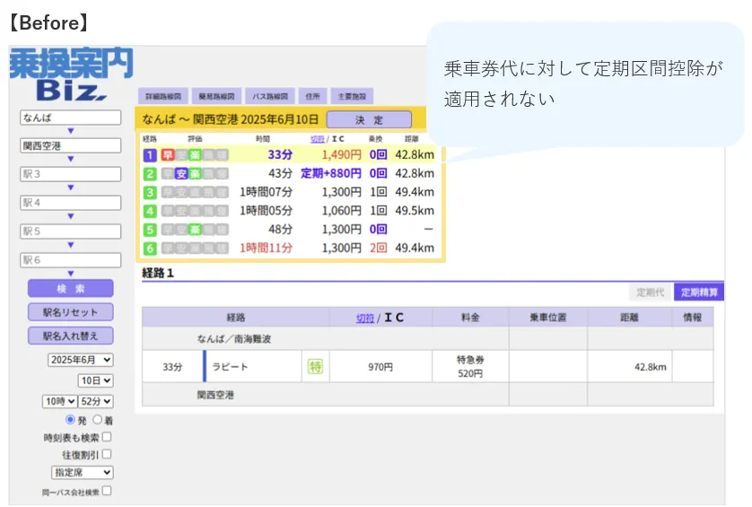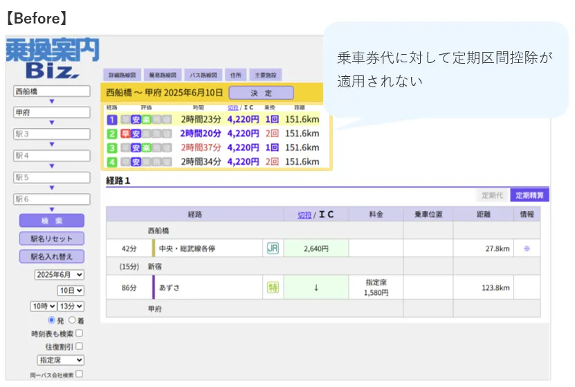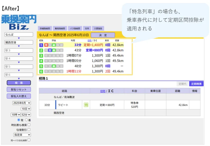 本仕様改善により、「特急列車」の乗車券代に対しても定期区間控除が適用されるようになります。