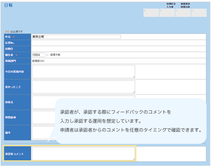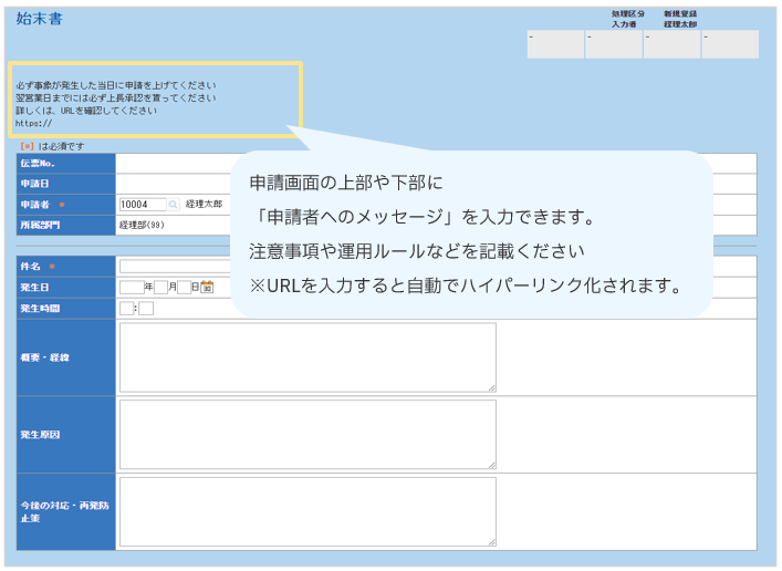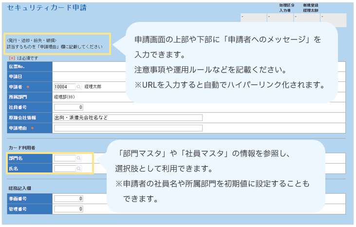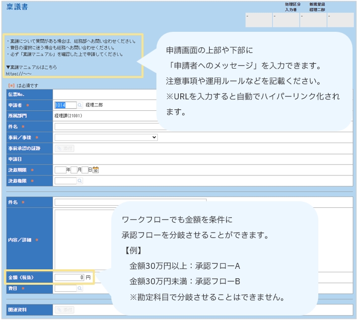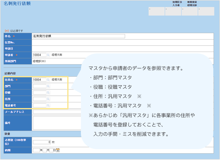 営業関連▶稟議書 ▶日報 ▶出張報告書 ▶社用車貸出申請 ▶レンタカー利用申請 総務関連 ▶事務用品発注依頼 ▶名刺発行依頼 ▶セキュリティカード申請 ▶押印申請 労務関連 ▶残業・休日出勤申請 ▶慶弔見舞申請 ▶有給休暇申請 ▶家族情報変更届 情報システム関連その他 |