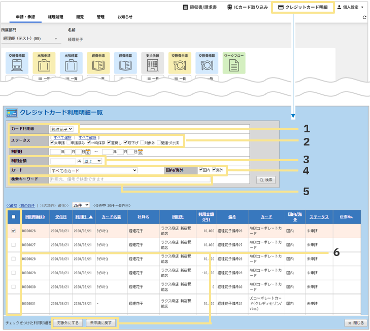 - ログインユーザの被代理申請者のクレカ利用明細を一覧で閲覧できます。