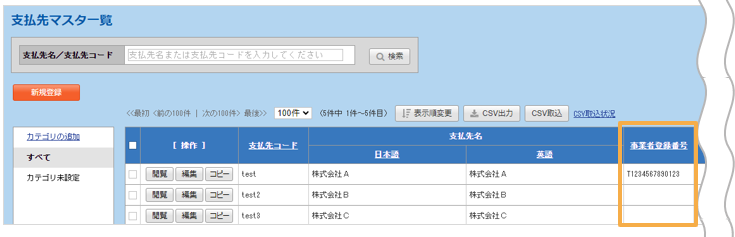 既にお使いのシステムで事業者登録番号を管理している場合、CSVによる一括取込も可能です。