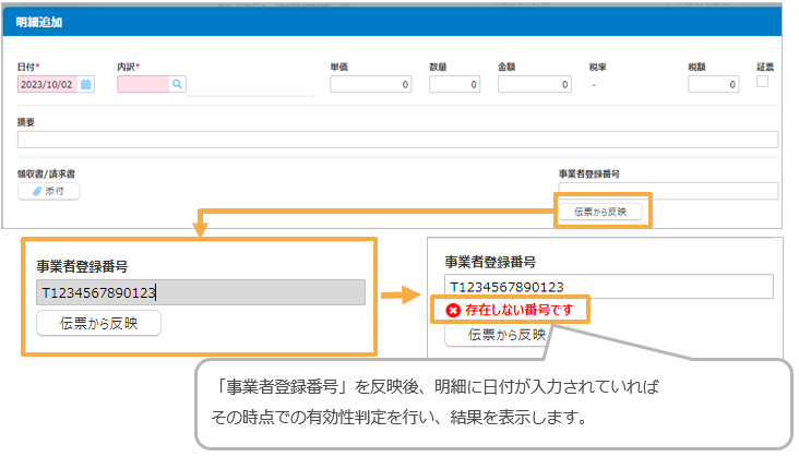 入力された「事業者登録番号」は、伝票明細の「日付」を基準日とし自動で有効性を判定されます。
