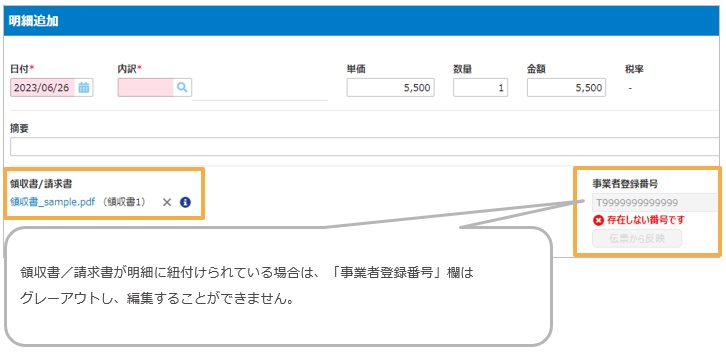 領収書/請求書が紐付いている場合は、領収書/請求書に登録されている「事業者登録番号」が
