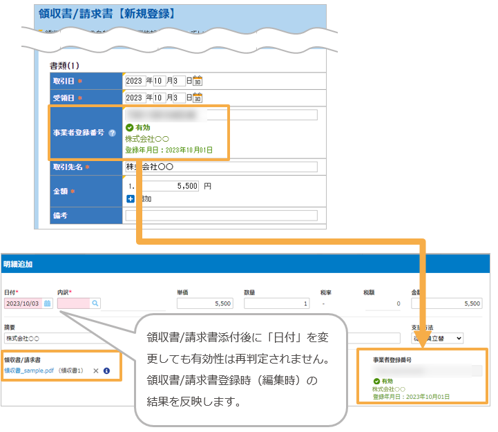 反映された「事業者登録番号」と明細の日付を基に有効性を判定します。