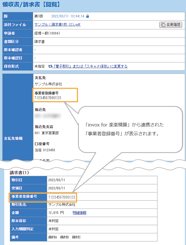 「invox for 楽楽精算」から連携された「適格請求書発行事業者番号」は、