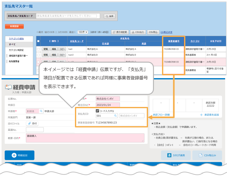 ■「支払先マスタ」に登録された「事業者登録番号」を伝票上に表示する