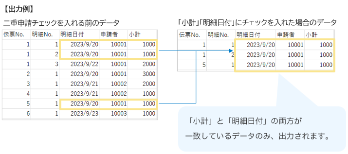 小計や明細日付、申請者などの項目が複数一致する伝票データをCSV形式で出力し、