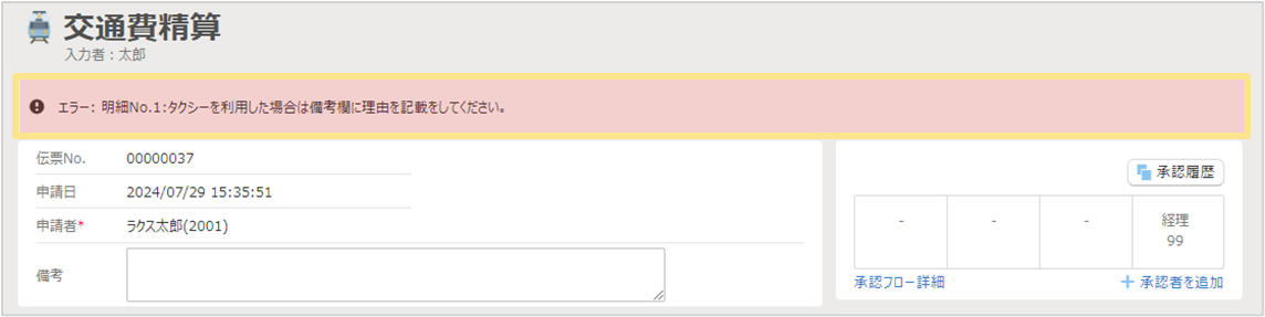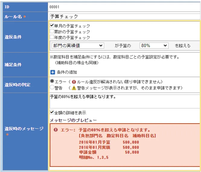 あらかじめ設定した「社内の申請ルール」に違反した場合、エラーや警告メッセージを表示し、