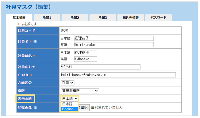 - 「パスワード設定メール」の本文の言語を決めるために「社員マスタ」で言語を切り替えます。